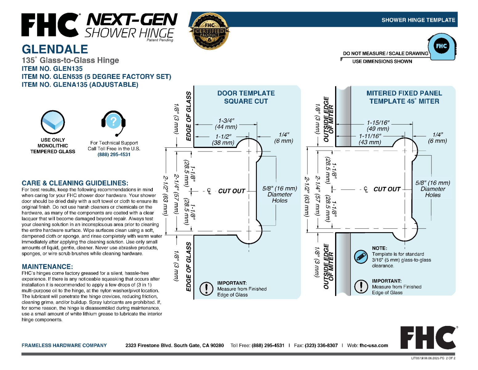 | MAXIMUM DOOR CAPACITY | 3/8″ (10 mm) GLASS Approx. 5 lb./ft² |