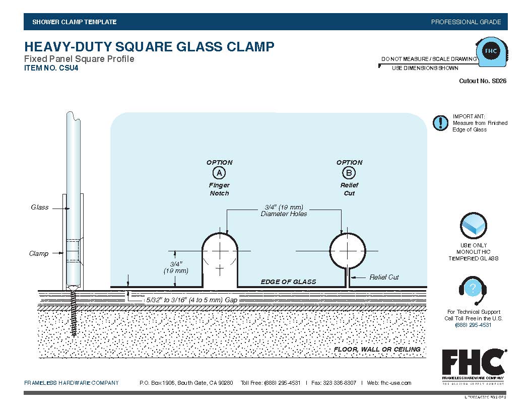 Only use tempered safety glass. To prevent damage to the hinge finish during installation, do not use power tools when installing these clamps.